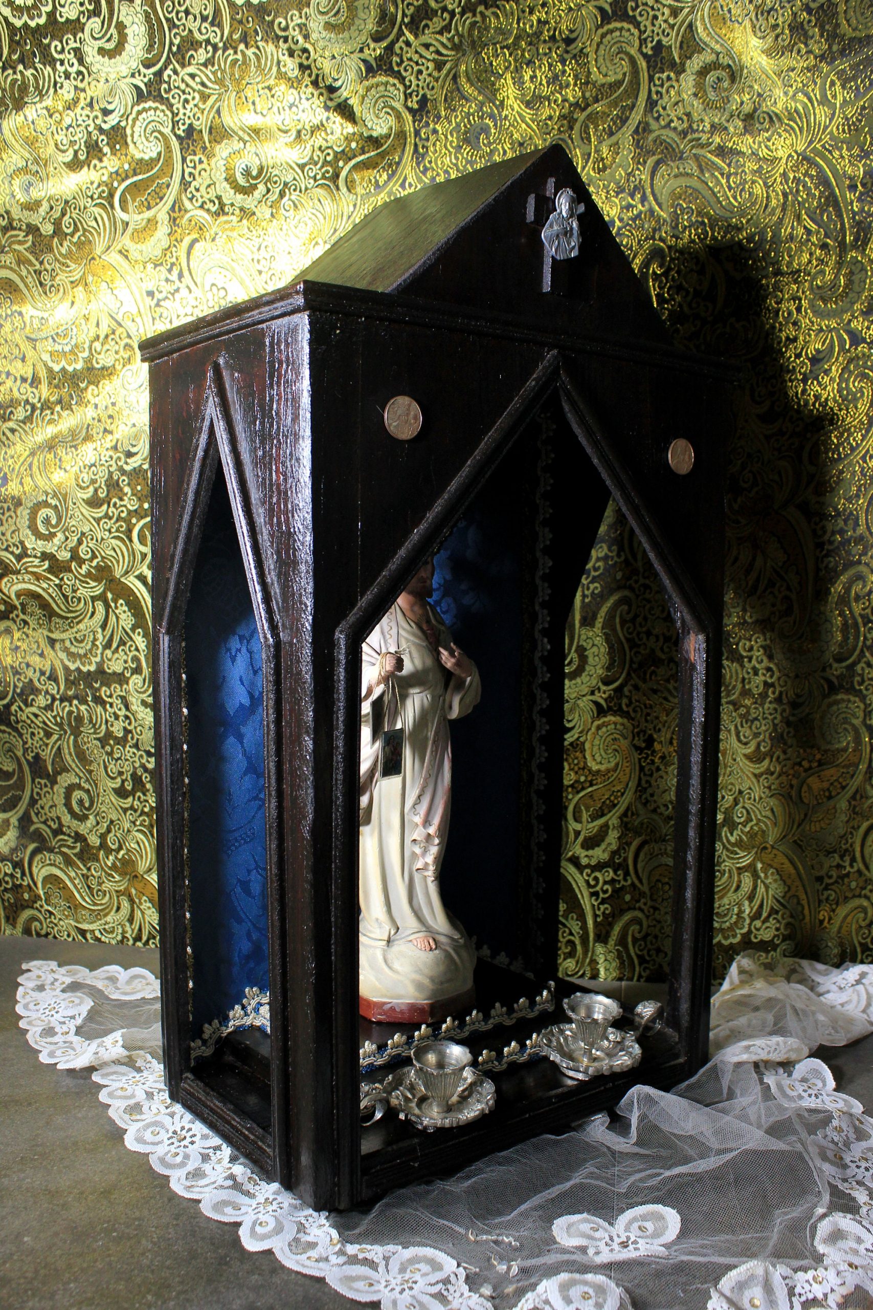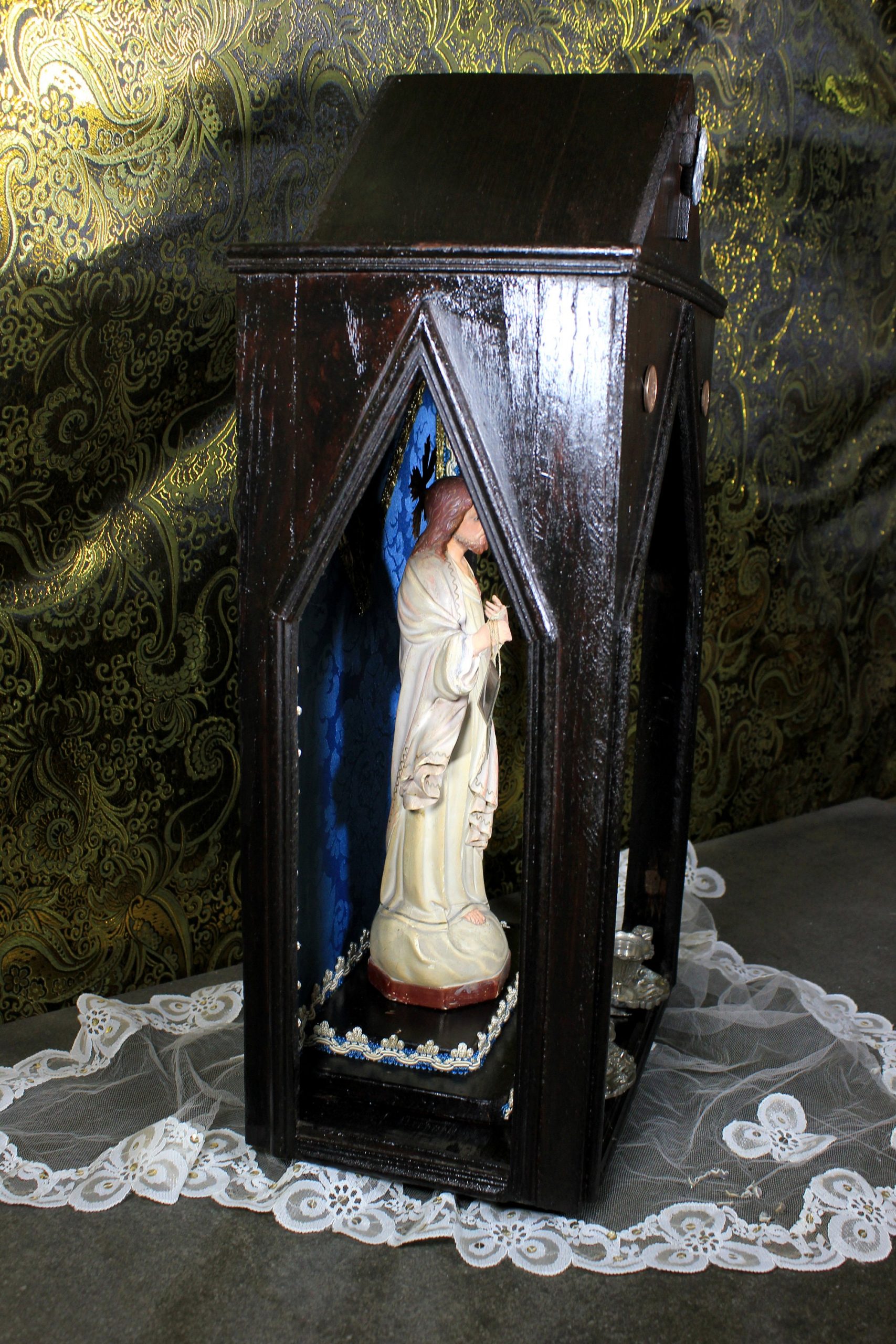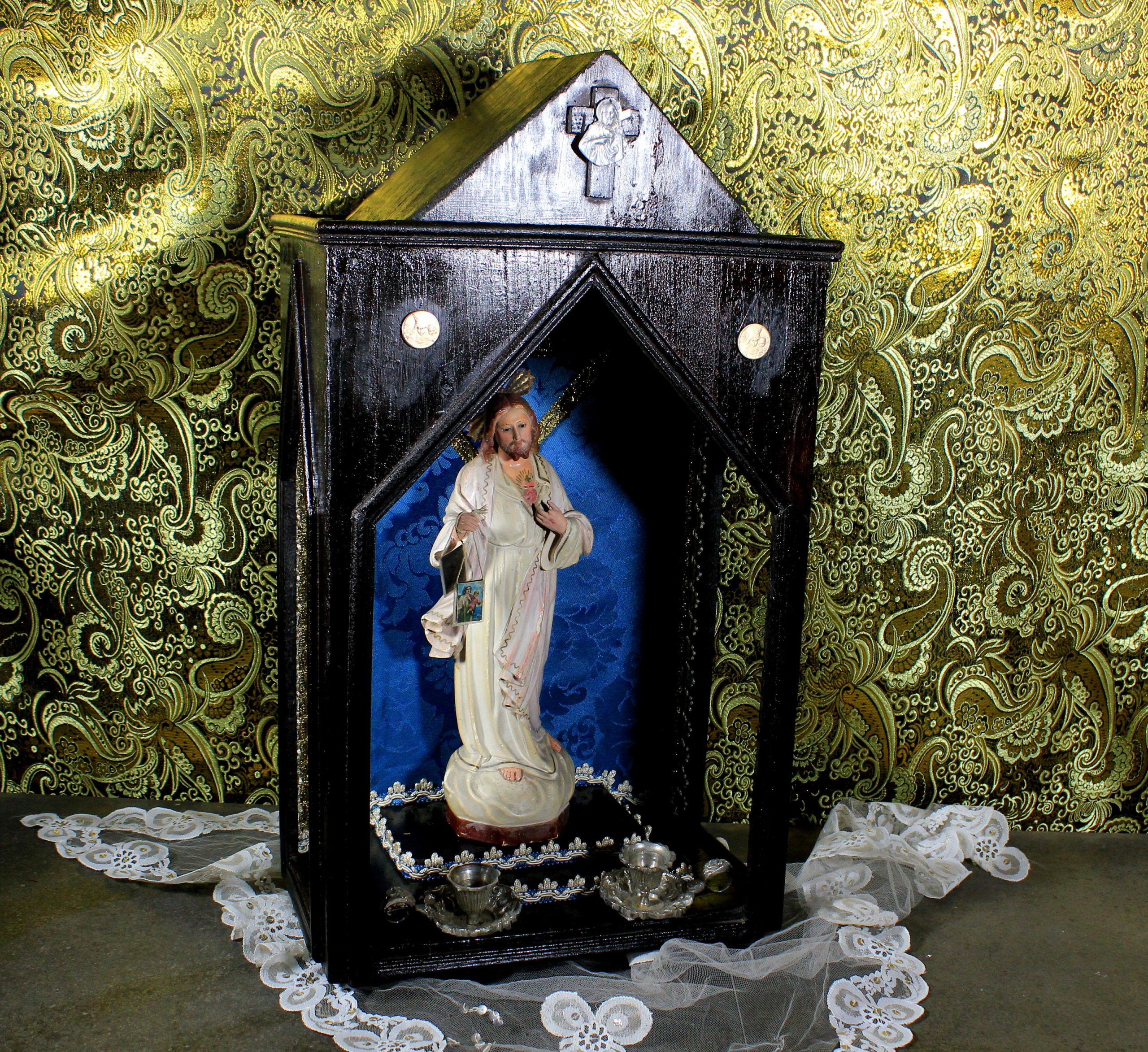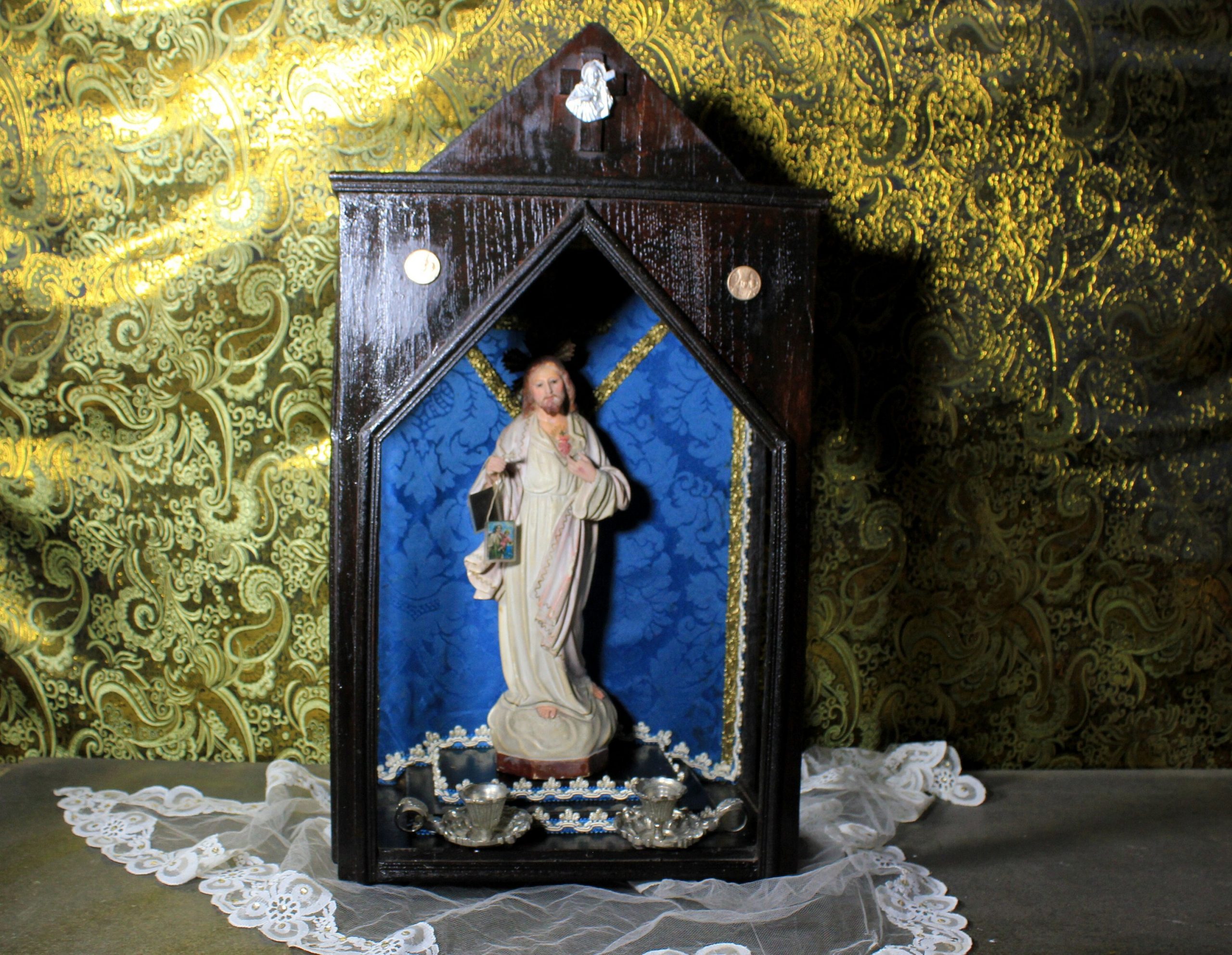 Antigua Capilla de Altar, 59 cm, Antigua Hornacina, Capilla Estilo Gótico, Hornacina Sagrado Corazón de Jesús, Capilla Madera con Jesús.