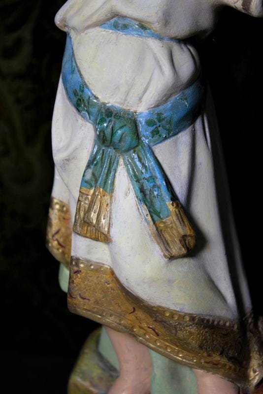 Este Niño tiene una gran calidad, como se ve por su perfecta armonía corporal. Ojos de cristal. Su estado de conservación es magnífico. Se ha procedido a su limpieza generalizada. No obstante, presenta algún faltante de color y algunas lagunas volumétricas en los dedos….