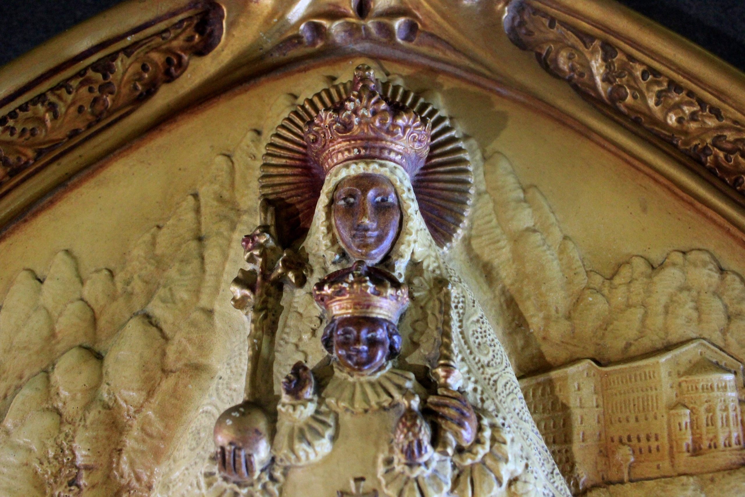 Plafón Virgen de Montserrat, Antigua Placa de la Virgen, Escena Religiosa, Alto Relieve Escayola, Icono Escultórico Escayola, Altar Virgen